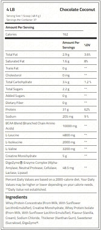 مركز بروتين مصل اللبن من سي إف إم (من الحليب، مُحضّر مع ليسيثين دوار الشمس)، أحادي هيدرات الكرياتين، بروتين مصل اللبن المعزول من سي إف إم (من الحليب، مُحضّر مع ليسيثين دوار الشمس)، مسحوق كاكاو قليل الدسم، نكهة (شوكولاتة، جوز الهند، كريمة)، كلوريد الصوديوم، مُكثّف (صمغ زانثان)، مُحلّي (سكرالوز)، مُركّب إنزيم هضمي ديجيزيم® (بروتياز مُحايد، ألفا أميليز، سيلولاز، لاكتاز، ليباز). مُسبّبات الحساسية: الحليب.