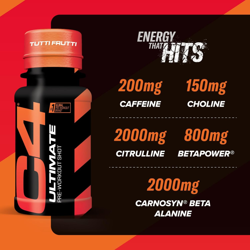 يقدم C4 Ultimate Shot تركيبة فريدة في صورة جرعة سائلة، مما يُسهّل تناوله دون الحاجة إلى خلط. هذا التصميم المريح والمحمول مثالي للاستخدام أثناء التنقل. كما أن تركيزه العالي من الكافيين والأحماض الأمينية الأساسية، مثل بيتا ألانين وL-سيترولين، يُميزه بوضوح عن غيره من مساحيق ما قبل التمرين.
