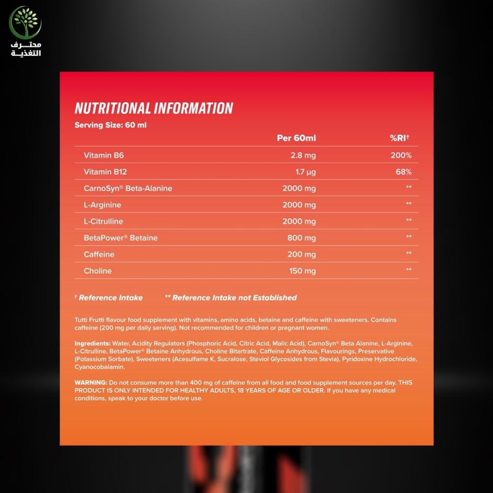 تناول جرعة واحدة (60 مل) قبل التمرين بحوالي 20 إلى 30 دقيقة. رج العبوة جيدًا قبل الاستخدام. لا تتجاوز جرعة واحدة يوميًا. لتجنب إدمان الكافيين، استخدم المنتج مرتين إلى ثلاث مرات أسبوعيًا.