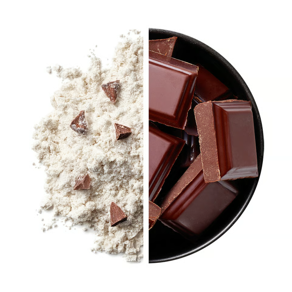 بروتين الحليب ، خليط الخفق (شراب الجلوكوز، زيت النخيل، بروتين الحليب ، مثبتات فوسفات البوتاسيوم وE 452، مستحلب E 471، عامل مضاد للتكتل ثاني أكسيد السيليكون، لون E 160a)، كاكاو، قطع شوكولاتة 4٪ (محلي مالتيتول، كتلة الكاكاو، زبدة الكاكاو، مستحلب ليسيثين الصويا ، نكهة طبيعية)، كلوريد الصوديوم، نكهة، مثبتات صمغ السنط وصمغ الزانثان، مكثف صمغ الغوار، عامل مضاد للتكتل ثاني أكسيد السيليكون، إينولين، محليات السكرالوز وجليكوسيدات ستيفيول.